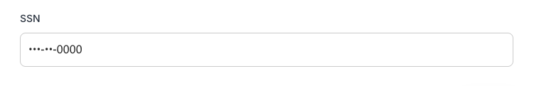 SSN fields use the standard XXX-XX-XXXX pattern. EIN fields use XX-XXXXXXX. Both mask the value on blur - when the respondent clicks or tabs away from the field, the displayed value is replaced with a masked version. The actual value is still stored and passed downstream. It is only re-masked if it reaches another form with a matching SSN or EIN formatted field.