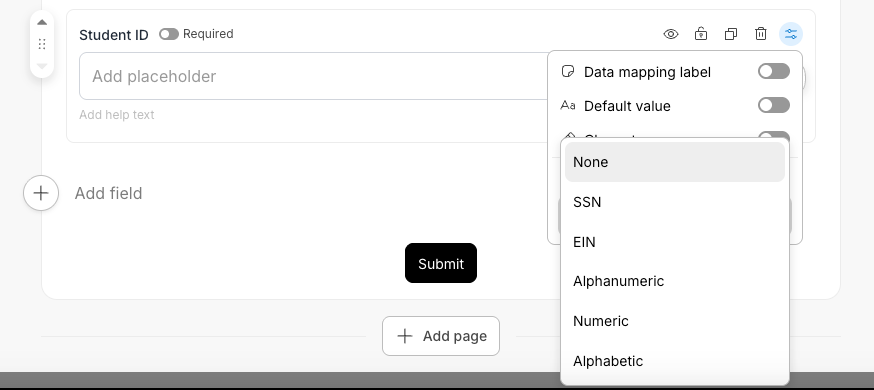 For the HR team example, that means the SSN collected in the intake form arrives in the exact same format when it reaches a document generation step, a data push to payroll, or an export to CSV. No transformation logic. No cleanup step. The format is set once and holds.