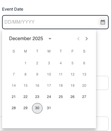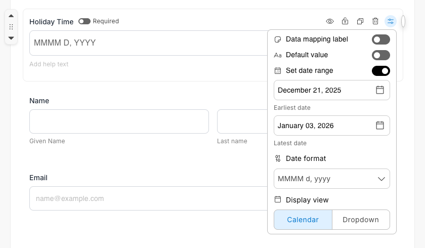 What you can do now: Date fields let you set a valid date range. Dates outside your window appear greyed out in the calendar picker—users can't select them. No more invalid submissions. No more manual cleanup.