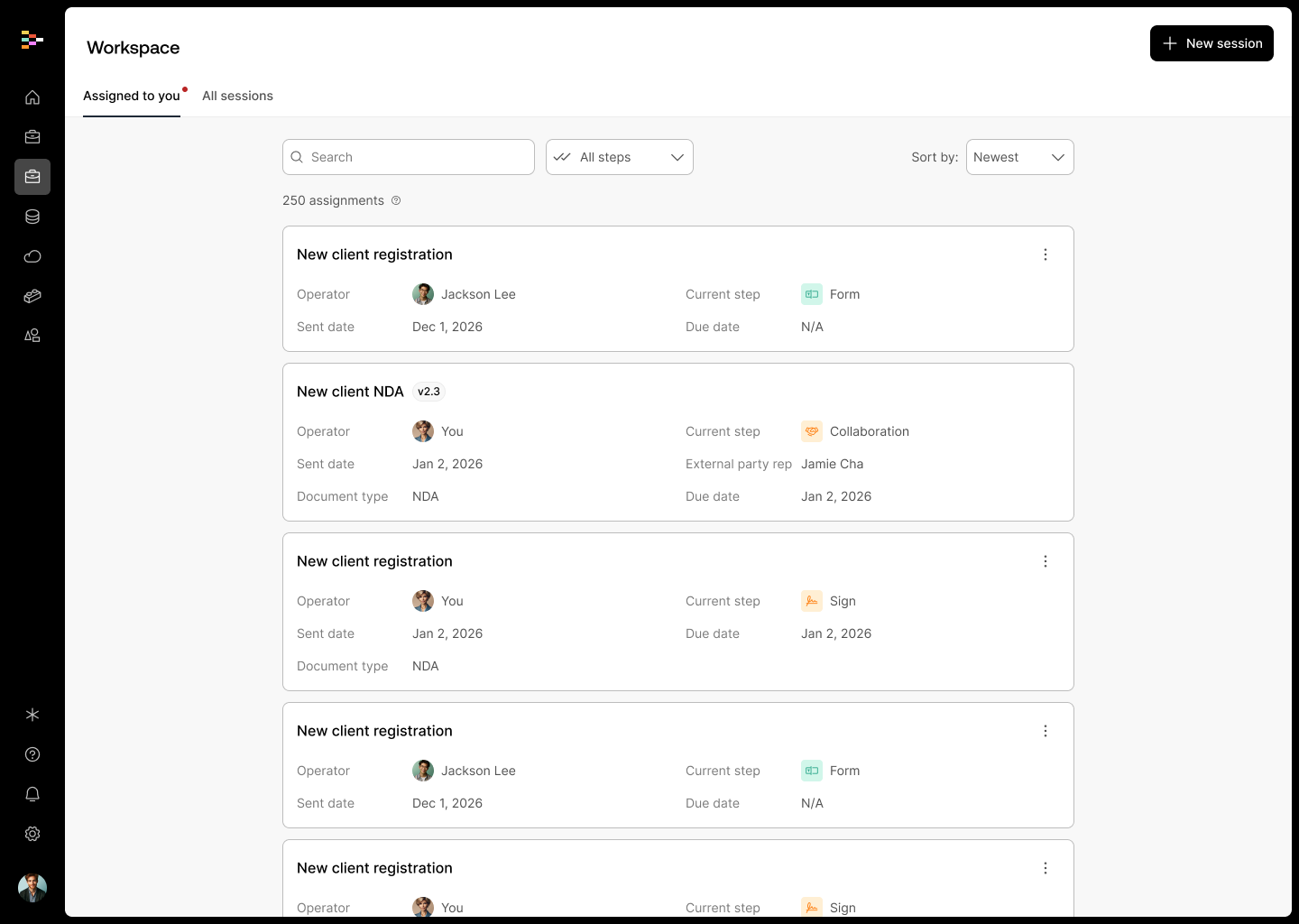 The Quick Send feature was added to the recently refreshed Workspace—your central hub for monitoring workflow sessions across your Streamline account. The Workspace is where you go to ensure sessions are running smoothly and to view all tasks assigned to you.