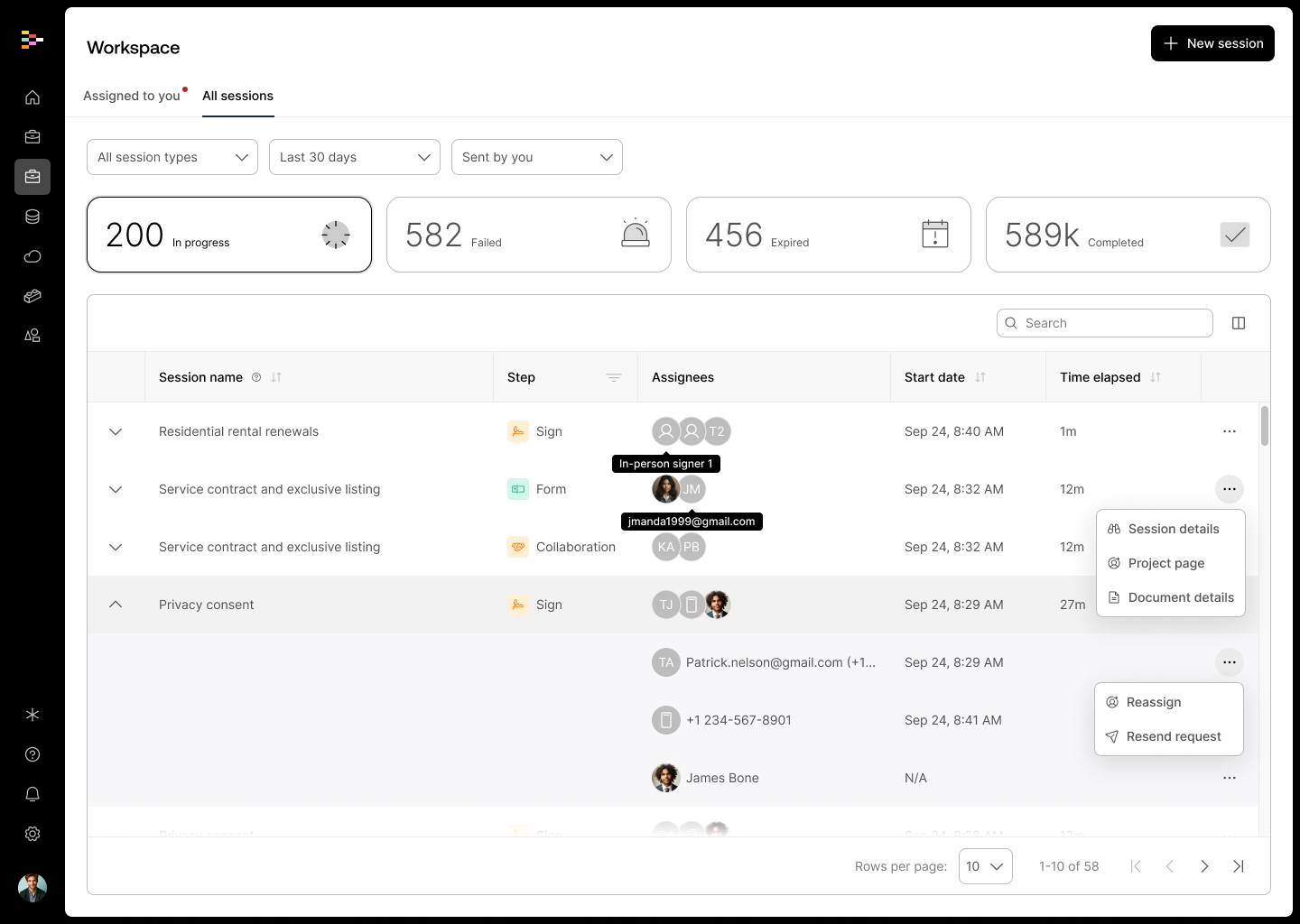- Role-based access controls: Quick Send & Workspace is available to all Streamline user roles. The All Sessions view is perfect for Administrators who are looking to maintain visibility across all workflows. Note that Managers, Builders, and Operators can see all Quick Send sessions; however, they will only see other project-related sessions in the Workspace that are associated with projects that they already have access to.